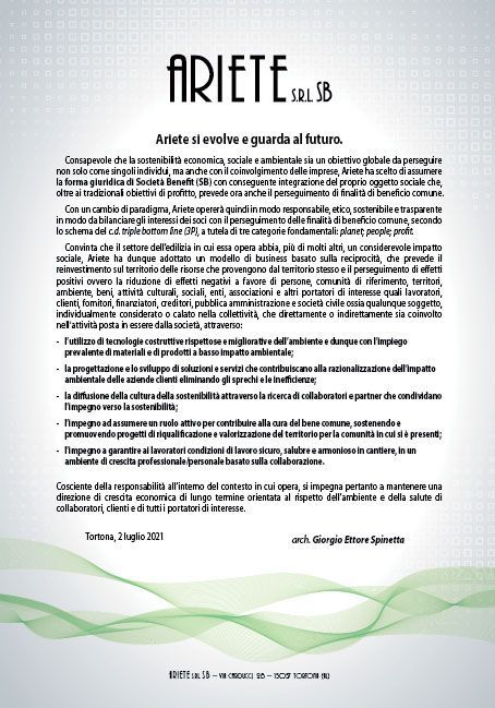 Aware that economic, social, and environmental sustainability is a global goal to be pursued not only by individuals but also through the involvement of businesses, Ariete has chosen to adopt the legal form of a Benefit Corporation (SB), thereby integrating its corporate purpose into its traditional profit-making objectives, which now also includes the pursuit of common benefit goals.